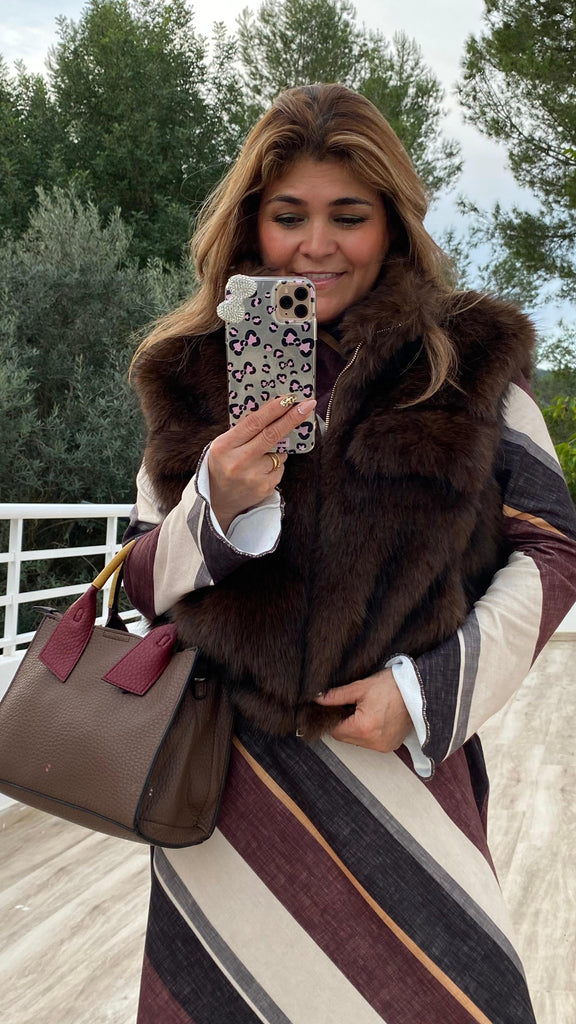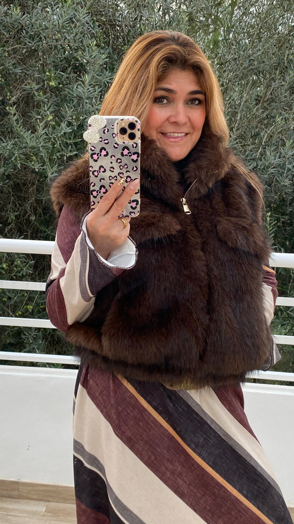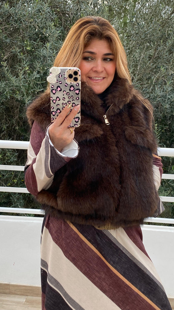 Chaleco de pelo sintético marrón chocolate (lleva cremallera y bolsillos)