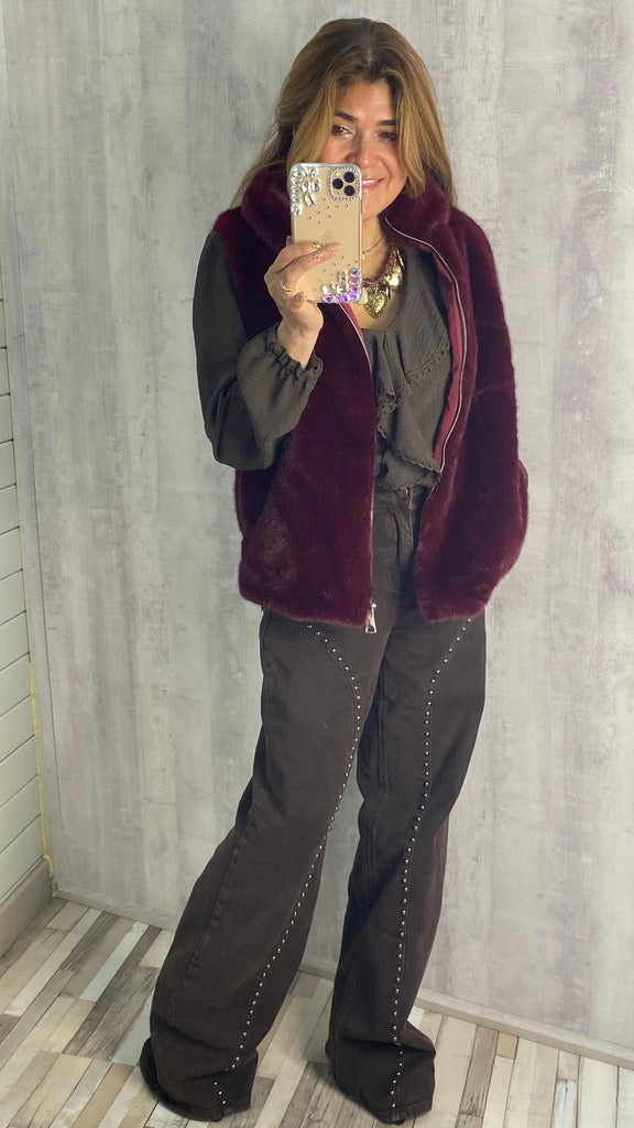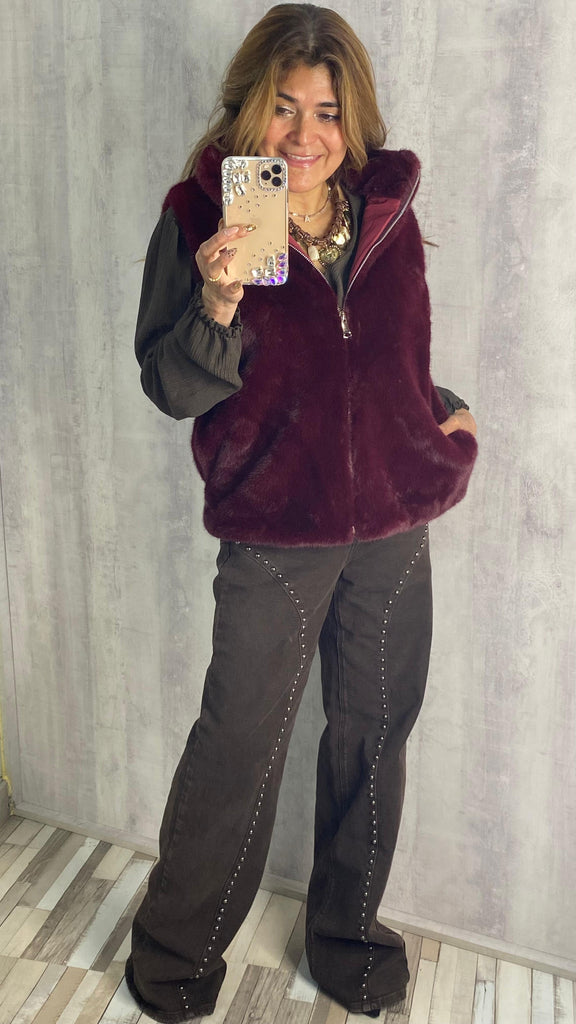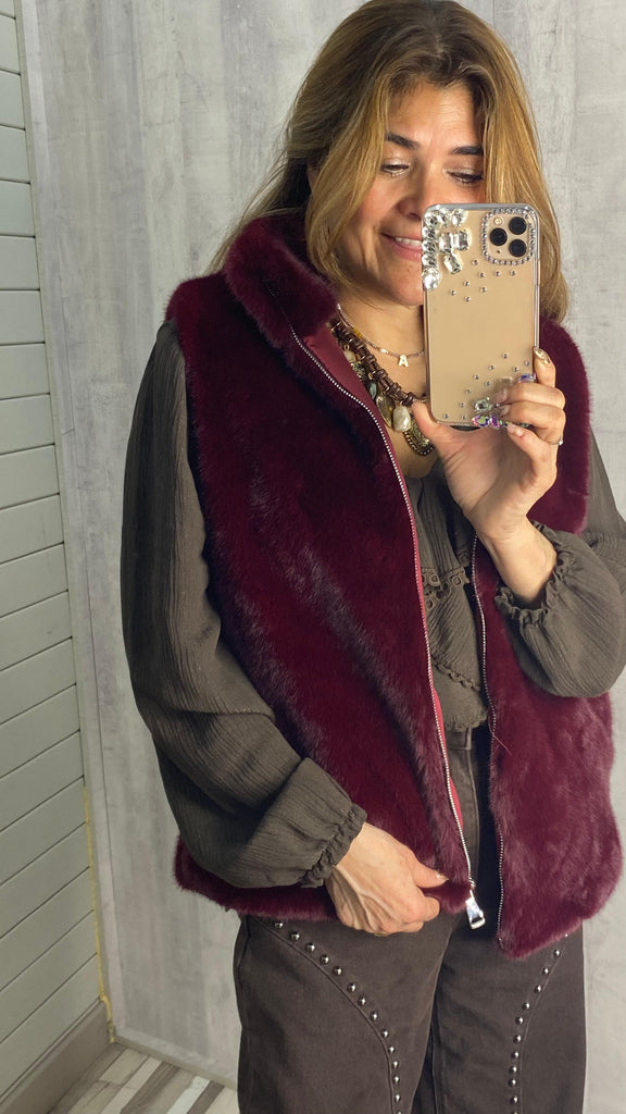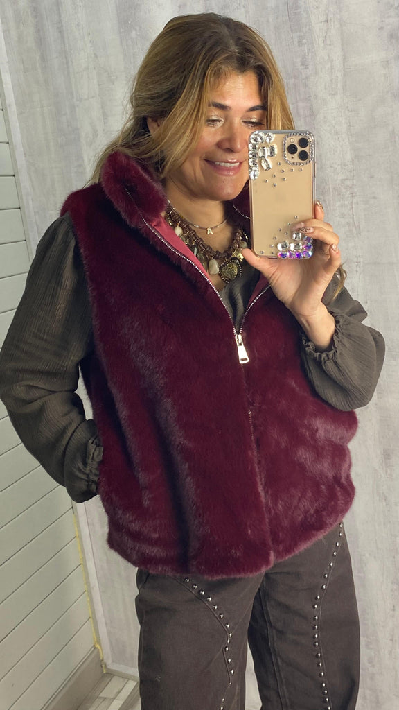 Chaleco granate de pelo sintético (lleva cremallera, bolsillos, es suave y tiene buena calidad)
