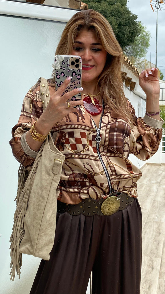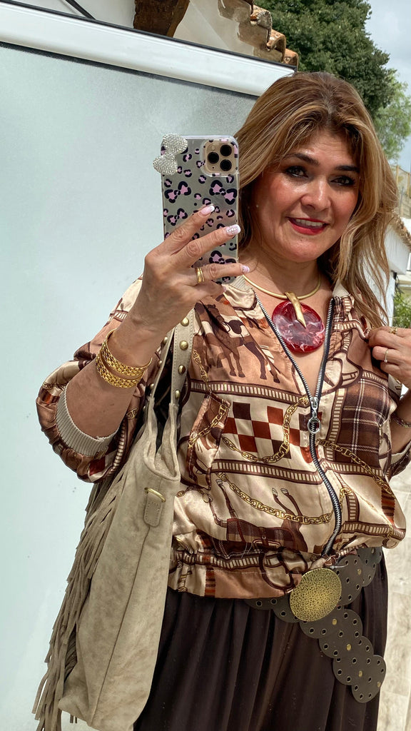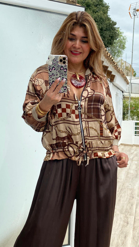Chaqueta bomber satinada estampada en tonos marrón, beige y camel
