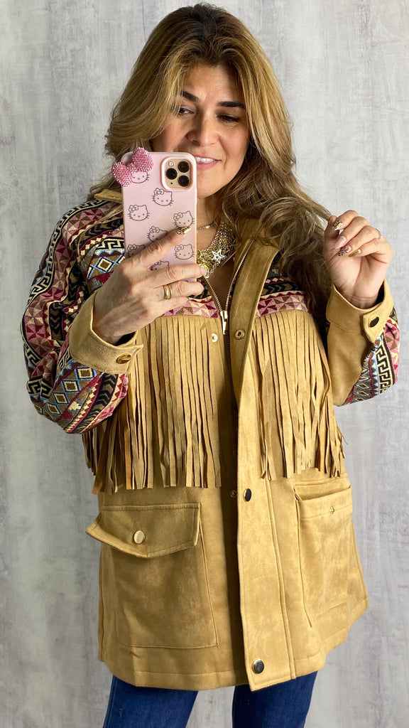 Chaqueta con flecos camel de antelina y bordados étnicos
