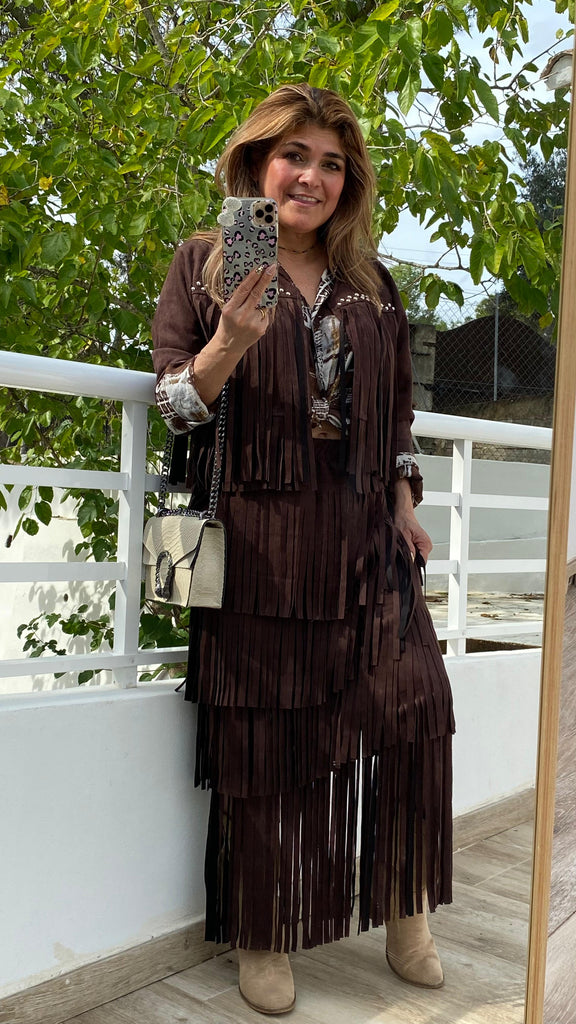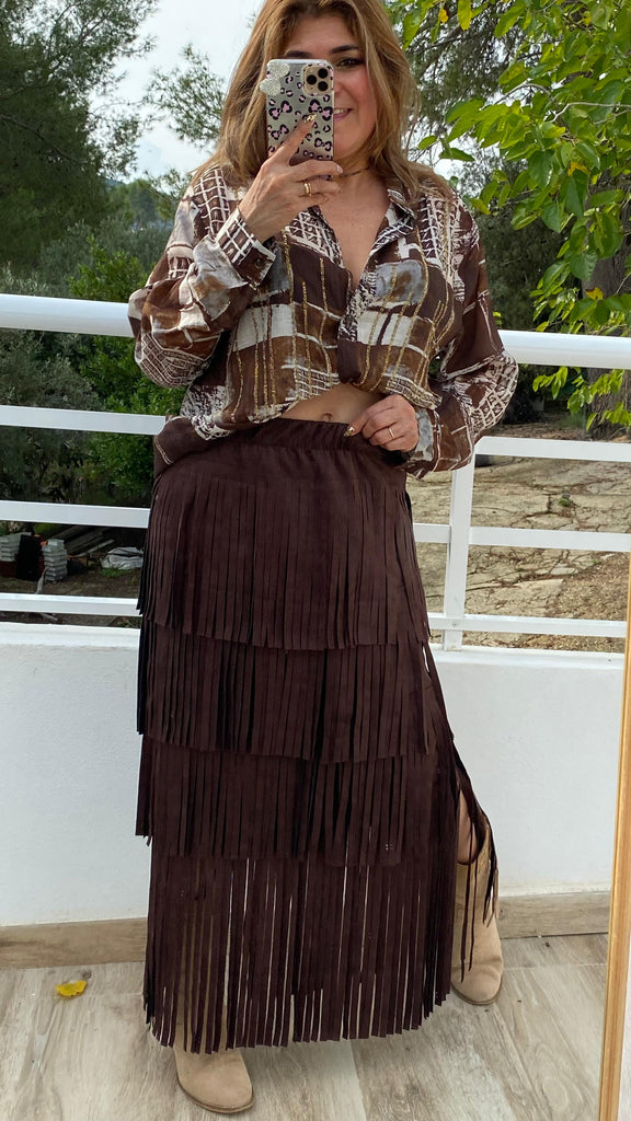 Falda marrón chocolate de antelina con flecos(es elástica y lleva goma en la cintura)