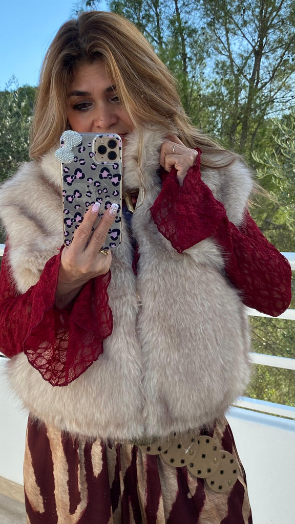 Pantalón bombacho satinado granate y beige (lleva bolsillos y goma en la cintura y el tobillo)