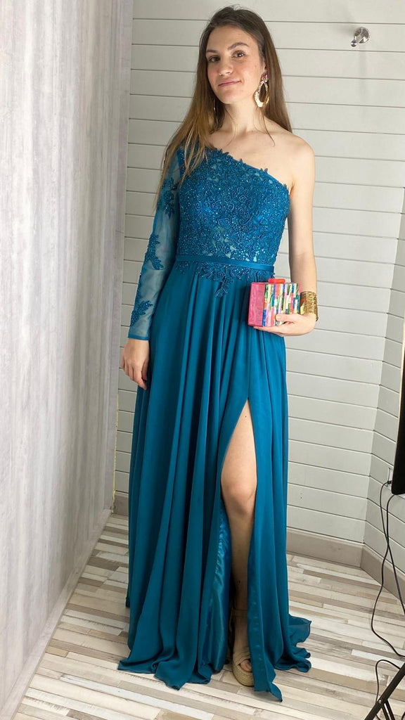Vestido de gasa asimétrico azul petróleo bordado con pedrería ( lleva una manga y abertura en la pierna)
