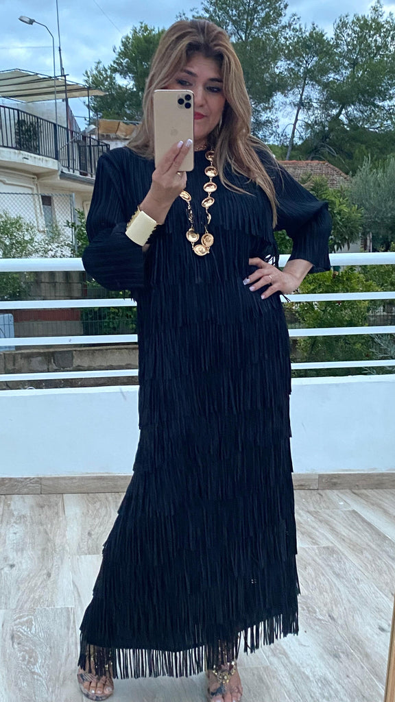 Vestido Alicia negro con flecos( es elástico, lleva flecos solo por delante, mangas semi largas y tiene un largo midi)