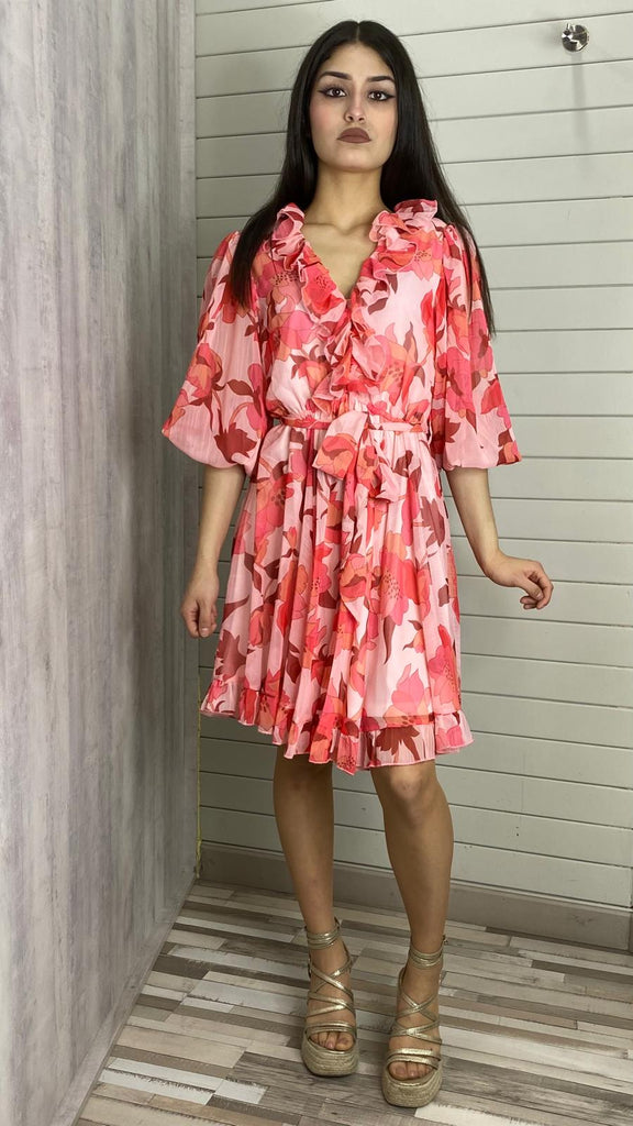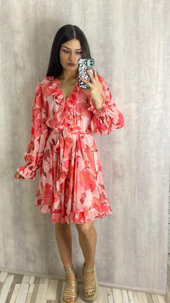 Vestido estampado en tonos corales (lleva goma en la cintura ,escote con volantes delante y atrás, goma en los puños)