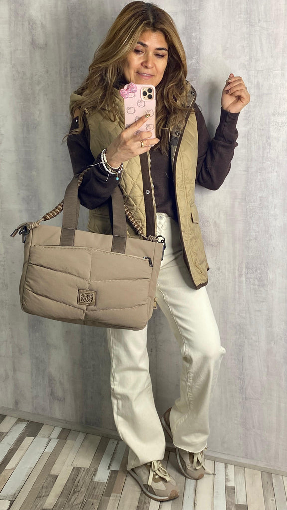 Bolso acolchado color topo (lleva asa larga y varios bolsillos)